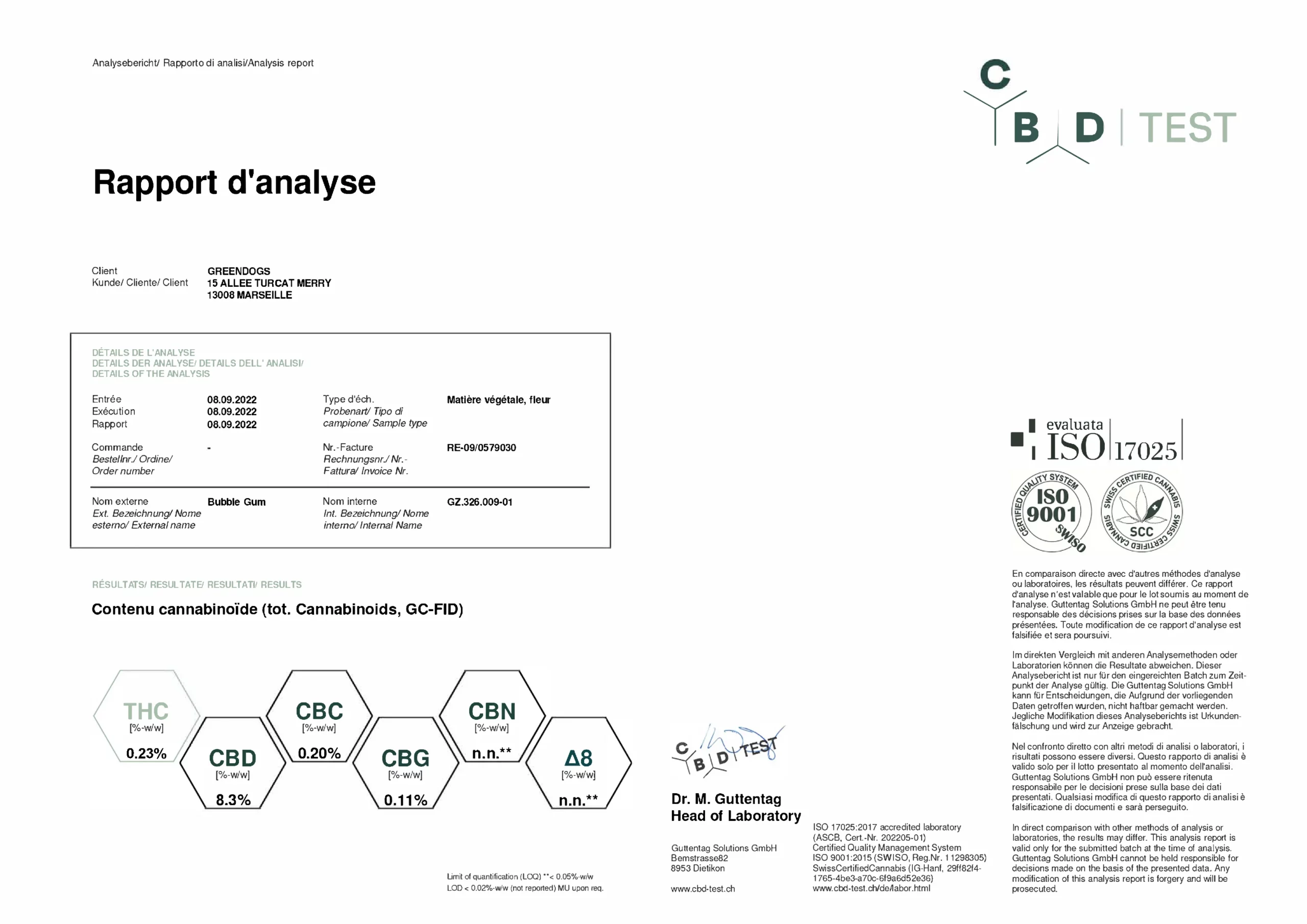 La fleur de CBD Bubble Gum est une variété hybride à dominance Indica cultivée en intérieur sur sol vivant sous LED. Elle développe des buds de taille moyenne à grosse, compactes, d’un beau vert clair avec une cristallisation omniprésente. La manucure est parfaite et ne laisse aucune feuille. Le curing a bien été mené et nous avons ici des têtes bien sèches et craquantes.