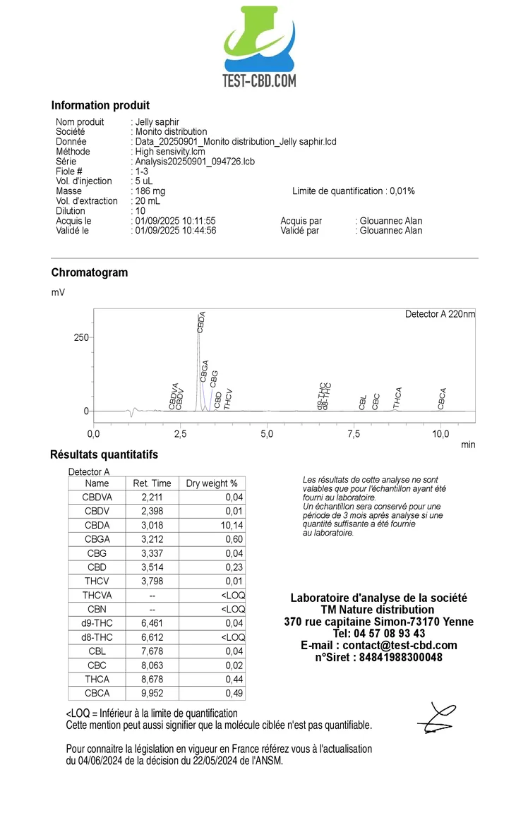 - CBD : 9,05% ; THC : 0,10%