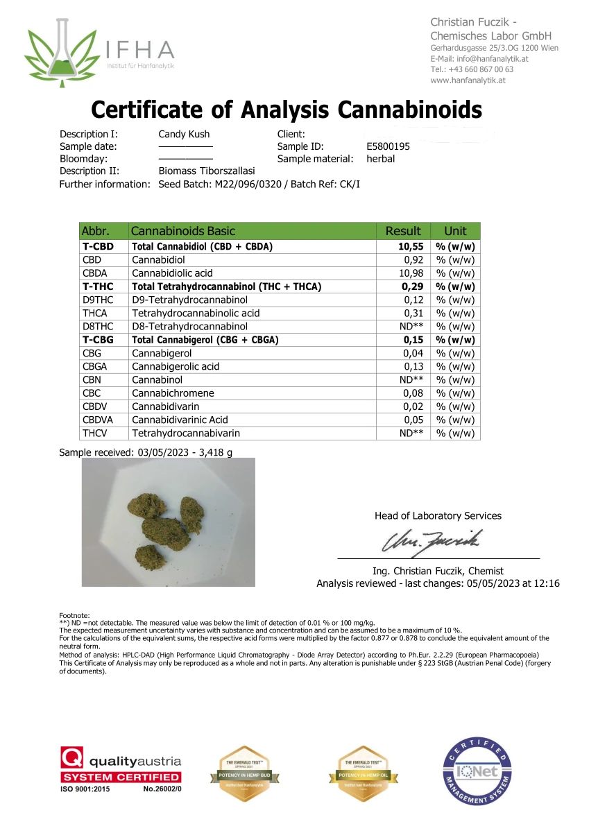La Kali Kandy Kush est une variété de cannabis de type « cali » comme son nom l’indique. Variété breedée et produite en Californie. Signalons au passage que cette fleur et arrivée 2ème en 2023 à la SPANNABIS cup dans la catégorie fleur de CBD. Cette génétique produit des buds pouvant être très grosses, très compactes et d’un beau vert clair constellé de filaments oranges et présentant une belle cristallisation. La manucure est parfaite. Le curing est de bonne qualité, cette fleur peut être consommée tel quel.