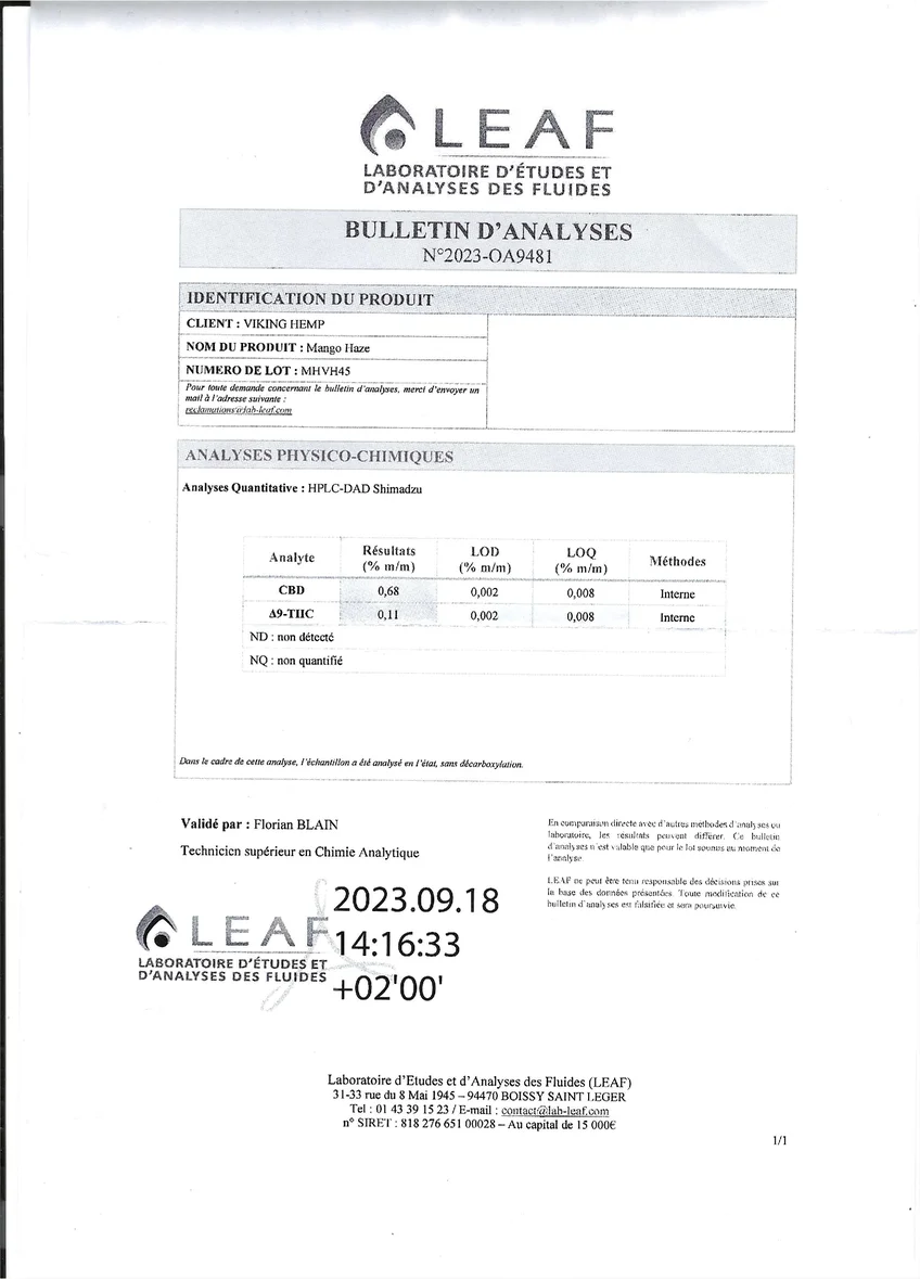 - CBD : 12,00% ; THC : 0,11%