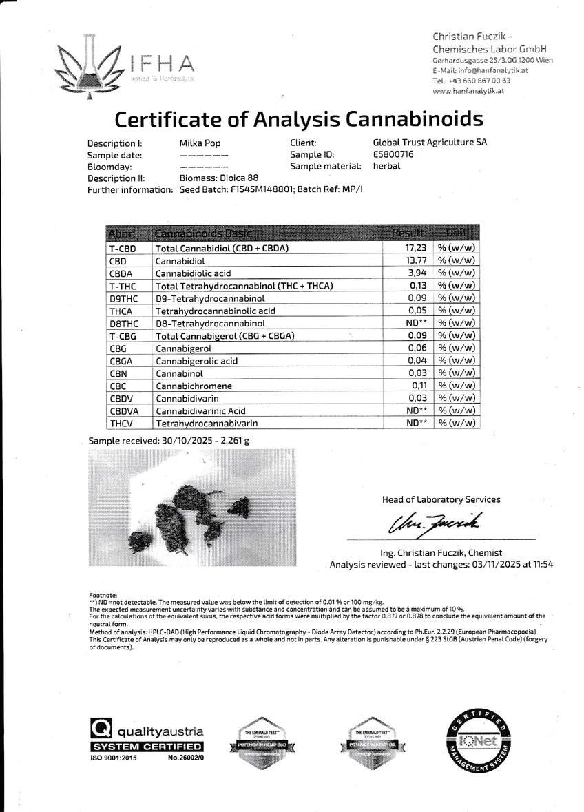 - CBD : 17,23% ; THC : 0,13%