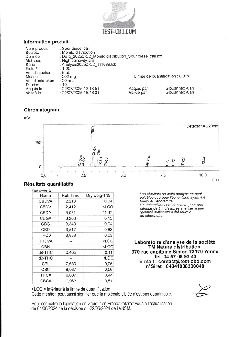 La Sour Diesel Cali offre des effets énergisants et stimulants psychiquement. Elle favorise la motivation, la clarté mentale, et apporte un léger boost cérébral particulièrement apprécié :