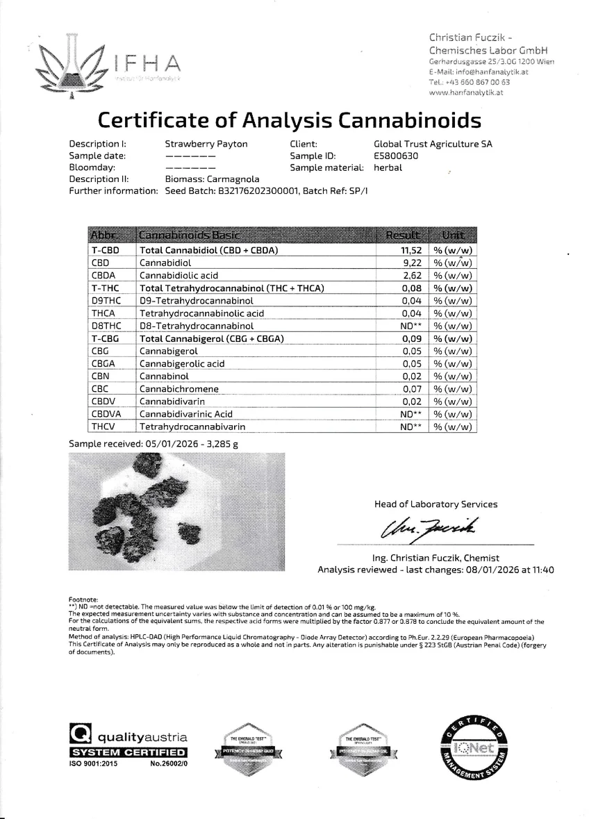 - CBD : 11,52% ; THC : 0,08%