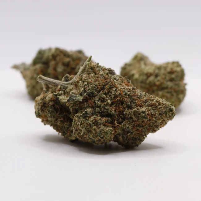 La Tangerine Dream CBD se présente sous forme de petits buds compacts, denses et bien structurés, affichant une teinte vert moyen largement recouverte de pollen. Quelques pistils marron viennent ponctuer l’ensemble, apportant un contraste naturel. La manucure quasi parfaite met en valeur la structure des fleurs, tandis que le curing précis offre une texture bien sèche, craquante et propre, fidèle aux standards d’une fleur CBD de qualité premium.