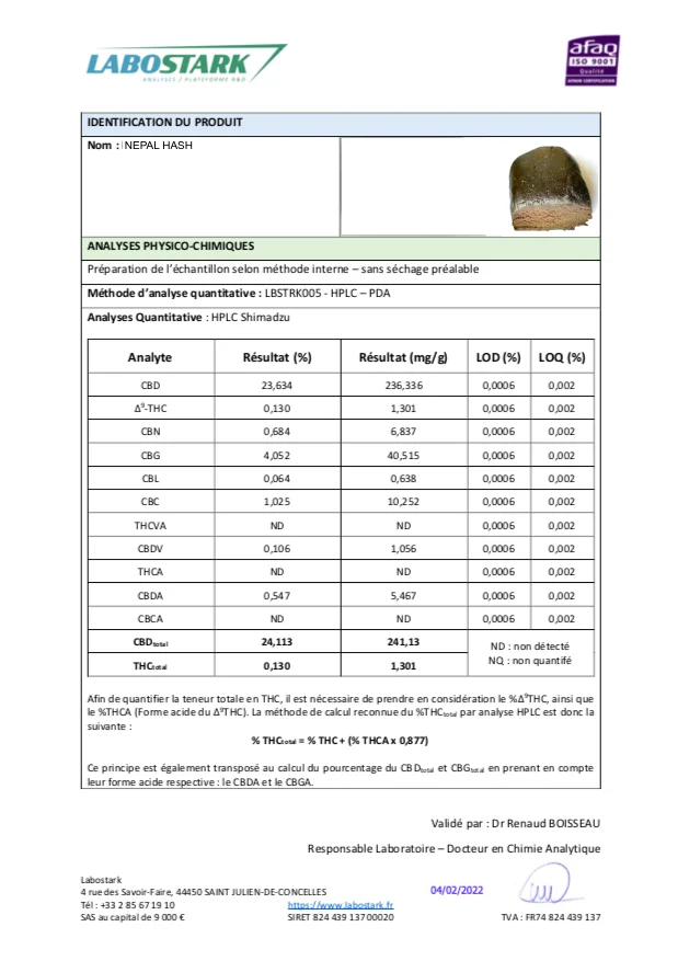 - Cannabinoïdes : THC : 0.15% (taux légal 0.3%) CBD : 29.43%