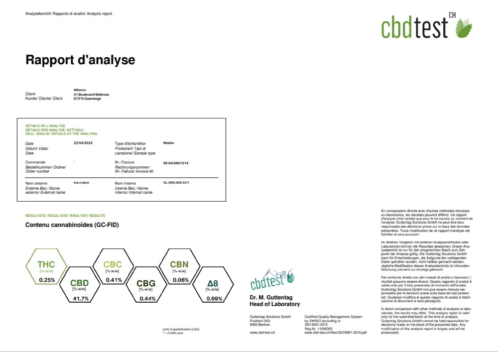 - THC : 0.25% (taux légal 0.3%) CBD : 41,70%